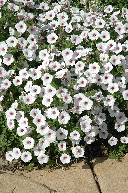 Supertunia Vista® Silverberry Petunia is smothered in stunning white trumpet-shaped flowers with pink veins at the ends of the stems from mid spring to mid fall. Its pointy leaves remain green in colour throughout the season.