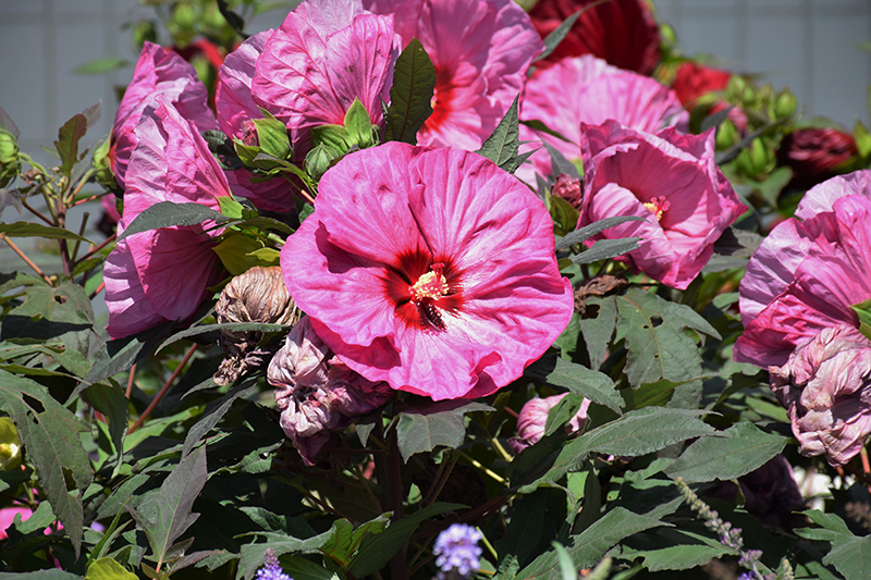 Summerific® Berry Awesome Hibiscus features bold lavender round flowers with pink overtones, red eyes and creamy white anthers along the stems from mid summer to early fall. Its large serrated lobed leaves remain dark green in colour with distinctive red veins throughout the season.