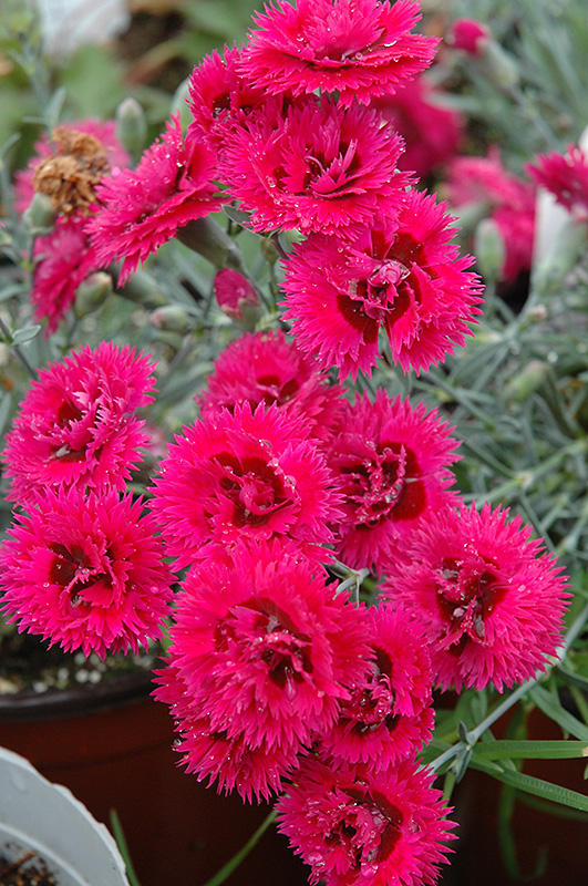 Starlette Pinks will grow to be only 6 inches tall at maturity extending to 8 inches tall with the flowers, with a spread of 12 inches. When grown in masses or used as a bedding plant, individual plants should be spaced approximately 8 inches apart. Its foliage tends to remain low and dense right to the ground. It grows at a medium rate, and under ideal conditions can be expected to live for approximately 10 years. As an evegreen perennial, this plant will typically keep its form and foliage year-round.