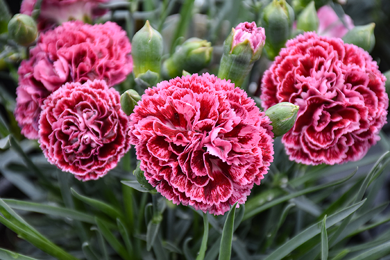 Fruit Punch® Cherry Vanilla Pinks has masses of beautiful fragrant double dark red frilly flowers with pink edges at the ends of the stems from late spring to mid summer, which are most effective when planted in groupings. The flowers are excellent for cutting. Its attractive narrow leaves remain grayish green in colour throughout the year.
